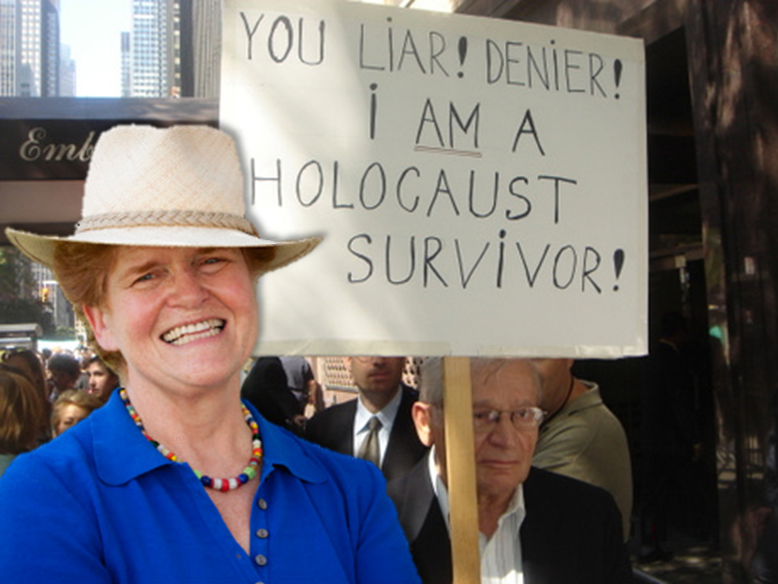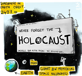 Six zillion up the chimney! My entire family made into a living room set! I was gassed six times! Electric belts and skull-crushing machines! Throwing babies into fire pits! Blood geysers! Smoke that was color-coded by national origin! This is "accurate history."